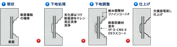 鉄筋のサビを落とした後、サビ止めをして樹脂モルタルで補修いたします。