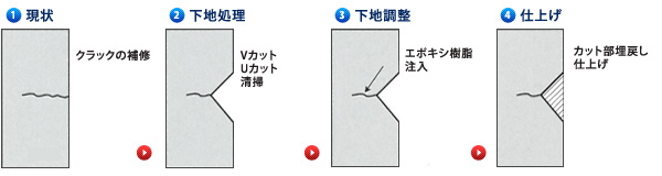 外壁に出来たひび割れ(クラック)の部分をV字またはU字にカットしてシーリング材のエポキシ樹脂を注入します。エポキシ樹脂を注入することによって非常に頑丈になります。施工後には目立たなくするよう表面を加工して補修いたします。